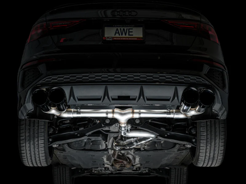 The Track Edition features a 3” inlet complete with an adapter to accommodate the factory downpipe perfectly while leaving an open 3” connection. Featuring minimal filter with one bullet resonator in the center, the Track Edition provides a full-bodied soundtrack at all times.. This configuration provides the best ratio of interior refinement and exterior rumble on the market. No valves needed. Switch driving modes and the exhaust will render the same result as a vavled exhaust. It’s the do-it-all exhaust for every day drivers. Comes complete with quad 4.5″ slash-cut, double-walled tips in diamond black. The AWE Track Edition for the 8Y S3 is made in the USA and backed by AWE’s Fitment Guarantee, 50 state emissions compliance, No Check Engine Light Guarantee, and the AWE Lifetime Warranty.