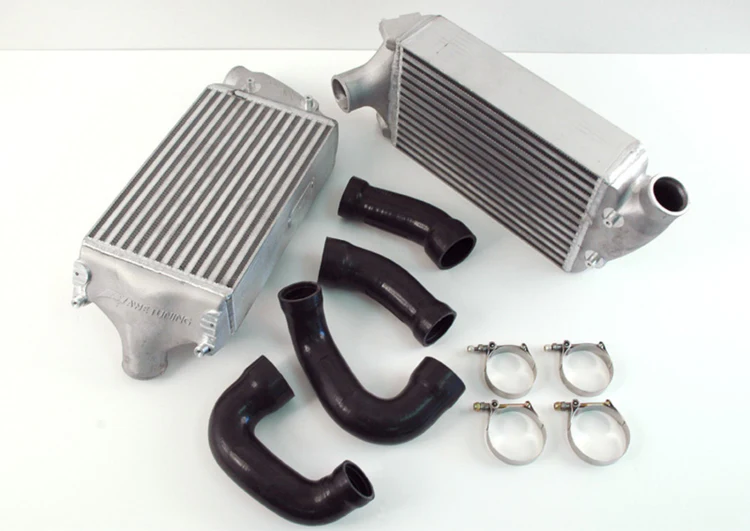 Presenting the AWE Porsche 997.2TT Performance Intercooler Kit. Cast End Tanks. Drop in Intake Air Temperature. Backed by AWE R&D. If you’re serious about consistent and proven power, read on. Behind the scenes: During development of AWE’s (now discontinued) 750R Turbo Kit for the 997.2TT, we experienced excessively high intake air temperatures. Since an OEM option was not available, and our power goals were well north of 700hp, we undertook the task to construct a completely new intercooler system. Once the end tanks were designed, then cast, they were then machined on our CNC mill, welded to specially designed cores, power tested, and refined on our AWD dyno. Size Matters: Compared to stock, the AWE Porsche 997.2TT Performance Intercoolers’ cores are 37% larger (422 cubic inches vs 308 cubic inches). In contrast to the stock cores, AWE Porsche 997.2TT Performance Intercoolers are a high flow bar and plate style and are built to our charge row and fin count specs. These specifications resulted in improved intake temperatures and improved drop pressure resistance through the core. Considering that extremely little trimming is involved to fit such effective units to the car, this is a huge engineering feat. In addition to the superior core and end tank design, the AWE Porsche 997.2TT Performance Intercooler kit also features 6-ply silicone hoses with gentle curves to prevent bursting under pressure. They are attached to the intake and turbos with stainless steel high force t-bolt clamps, and a molded lip is integrated where the hoses meet the turbos to imitate the factory locking mechanism. Further, our hoses use a Nomex braiding for superior strength, instead of more common polyester. The very best materials and industry leading engineering separate this kit from all others on the market.