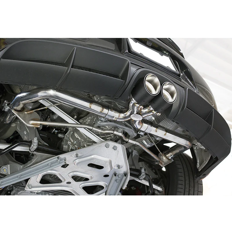 Full polished T304L stainless steel, beautifully welded together and finished off with hand made single wall stainless steel tips or premium carbon fiber shrouded tips which fit the rear bumper of the GT4 like a finely tailored suit.