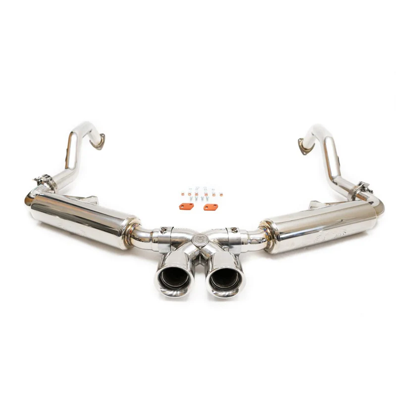 Our Supercup Exhaust System is a loud and aggressive performance exhaust system designed with track use in mind. This system is a lot lighter than the factory system and flows much better. The Supercup is significantly louder than our Maxflo Exhaust option, but if you’re looking for a very aggressive exhaust note and you’re not worried about waking up the neighbors, this is the system for you! If you want the best of both worlds, check out our TrackTec Valved Exhaust, which will be slightly louder than the Supercup with the valves open and just as civilized as our Maxflo system with the valves closed