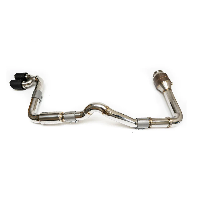 Full polished T304L stainless steel, beautifully welded together and finished off with hand made T304L single-wall stainless steel tips or premium carbon fiber shrouded tips which fit the rear bumper of the 718 like a finely tailored suit.